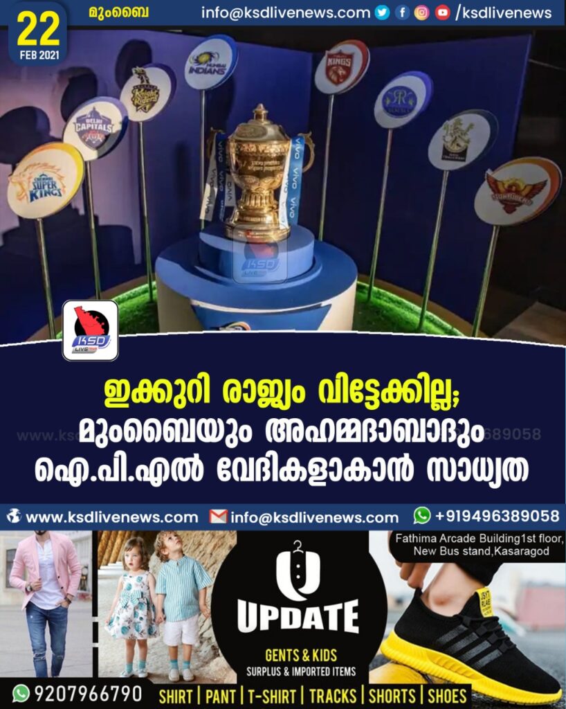 ഇക്കുറി രാജ്യം വിട്ടേക്കില്ല; മുംബൈയും അഹമ്മദാബാദും ഐ.പി.എല് വേദികളാകാന് സാധ്യത