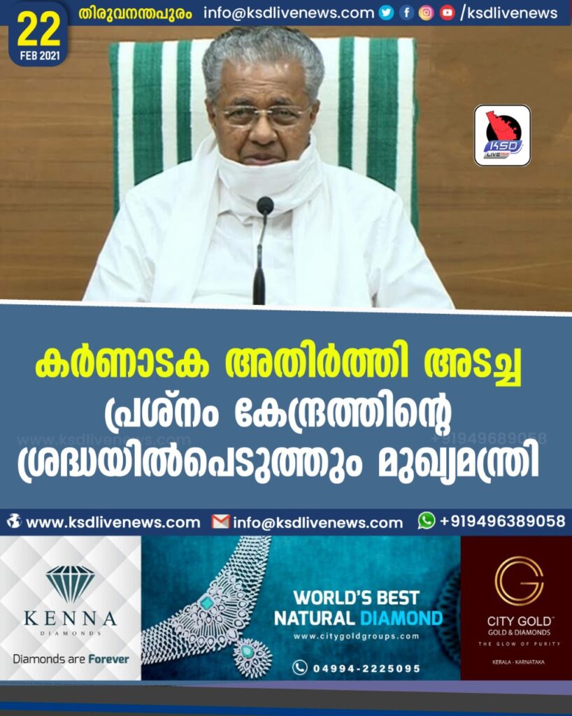 കര്ണാടക അതിര്ത്തി അടച്ച പ്രശ്നം കേന്ദ്രത്തിന്റെ ശ്രദ്ധയില്പെടുത്തും-മുഖ്യമന്ത്രി