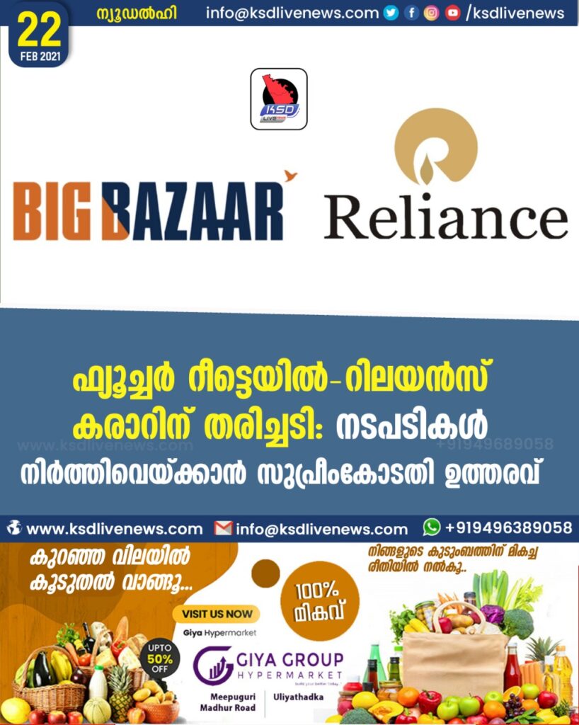 ഫ്യൂച്ചർ റീട്ടെയിൽ-റിലയൻസ് കരാറിന് തരിച്ചടി: നടപടികൾ നിർത്തിവെയ്ക്കാൻ സുപ്രീംകോടതി ഉത്തരവ്