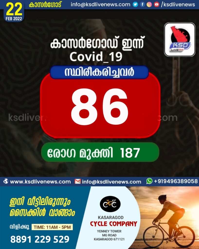 കാസർഗോഡ് ജില്ലയിൽ ഇന്ന് 86 പേർക്ക് കോവിഡ് സ്ഥിരീകരിച്ചു. 187 പേർക്ക് രോഗമുക്തി