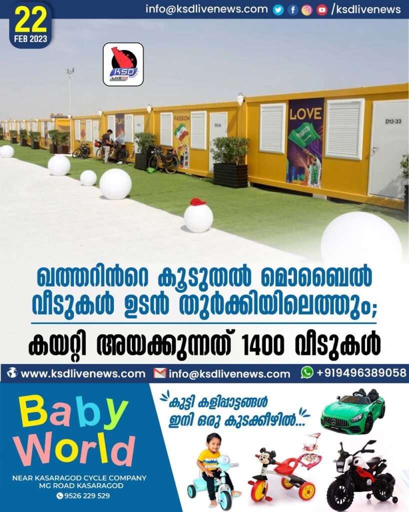 ഖത്തറിന്റെ കൂടുതല് മൊബൈല് വീടുകള് ഉടന് തുര്ക്കിയിലെത്തും. 1400 മൊബൈല് വീടുകളാണ് ഇത്തവണ കയറ്റിഅയക്കുന്നത്. ആകെ 10000 വീടുകള് ആണ് തുര്ക്കിയിലും സിറിയയിലുമായി എത്തിക്കുക 8 കപ്പലുകളിലായാണ് 1400 മൊബൈല് വീടുകള് തുര്ക്കിയിലേക്ക് കയറ്റി അയക്കുന്നത്. ലോകകപ്പ് ഫുട്ബോളിനായി ഒരുക്കിയ 10000 ഇത്തരം വീടുകള് തുര്ക്കിയിലെയും സിറിയയിലെയും ഭൂകമ്ബ ബാധിതര്ക്കായി ഖത്തര് വാഗ്ദാനം ചെയ്തിരുന്നു. ആദ്യഘട്ടത്തില് 306 വീടുകള് എത്തിക്കുകയും ചെയ്തു. മുഴുവനായി ഫര്ണിഷ് ചെയ്ത വീടുകളാണ് ഖത്തര് നല്കുന്നത്. 47000ത്തിലേറെ പേര്ക്ക് ജീവന് നഷ്ടപ്പെട്ട ദുരന്തത്തിന്റെ തുടക്കം മുതല് രക്ഷാപ്രവര്ത്തനത്തിലും സഹായം എത്തിക്കുന്നതിനും ഖത്തര് മുന്നിലുണ്ട്. മരുന്ന്, അടിയന്തര സഹായം എന്നിവയ്ക്കായി 253 മില്യണ് ഖത്തര് റിയാലിന്റെ സഹായമാണ് ഖത്തര് ഇതുവരെ എത്തിച്ചത്.