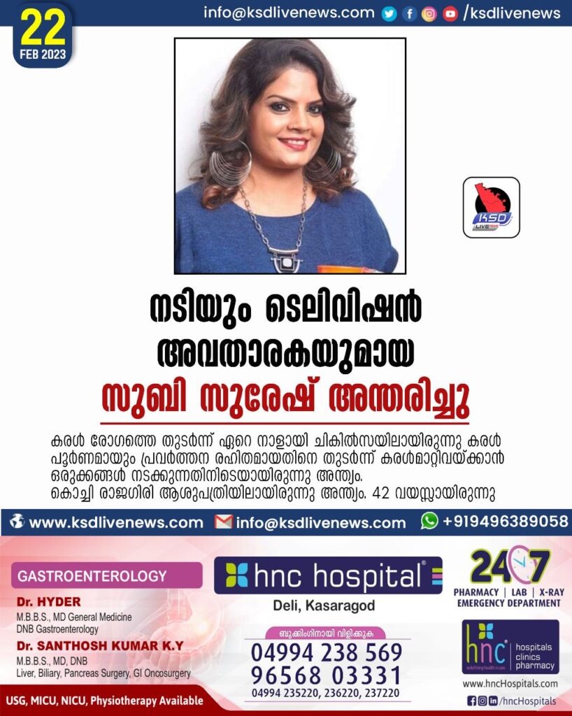 കൊച്ചി ∙ തനതായ ഹാസ്യശൈലി കൊണ്ട് ശ്രദ്ധ േനടിയ ചലച്ചിത്ര നടിയും ടെലിവിഷൻ അവതാരകയുമായ സുബി സുരേഷ് (42) അന്തരിച്ചു. കൊച്ചി രാജഗിരി ആശുപത്രിയിലായിരുന്നു അന്ത്യം. കരൾ രോഗത്തെ തുടർന്ന് ഏറെ നാളായി ചികിൽസയിലായിരുന്നു. കരൾ പൂർണമായും പ്രവർത്തന രഹിതമായതിനെ തുടർ‌ന്ന് കരൾ‌ മാറ്റിവയ്ക്കാൻ ഒരുക്കങ്ങൾ നടക്കുന്നതിനിടെയായിരുന്നു അന്ത്യം. രമേഷ് പിഷാരടി അടക്കമുള്ള സഹപ്രവർത്തകർ ഇന്നലെ ആശുപത്രിയിൽ സുബിയെ സന്ദർശിച്ചിരുന്നു. വരാപ്പുഴയ്ക്കടുത്ത് കൂനമ്മാവിലാണ് നിലവിൽ സുബി താമസിച്ചിരുന്നത്. മൃതദേഹം രാജഗിരി ആശുപത്രി മോർച്ചറിയിൽ സൂക്ഷിച്ചിരിക്കുകയാണ്. സംസ്കാരം നാളെ നടക്കും. അച്ഛന്‍: സുരേഷ്, അമ്മ: അംബിക, സഹോദരന്‍: എബി സുരേഷ്.