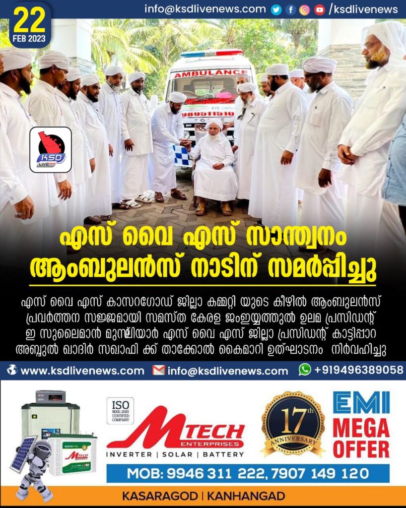 കാസറഗോഡ് : എസ് വൈ എസ് കാസറഗോഡ് ജില്ലാ കമ്മറ്റി യുടെ കീഴിൽ ആംബുലൻസ് പ്രവർത്തന സജ്ജമായി