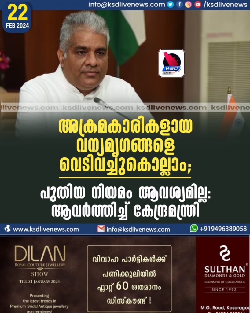 അക്രമകാരികളായ വന്യമൃഗങ്ങളെ വെടിവച്ചുകൊല്ലാം; പുതിയ നിയമം ആവശ്യമില്ല: ആവർത്തിച്ച് കേന്ദ്രമന്ത്രി