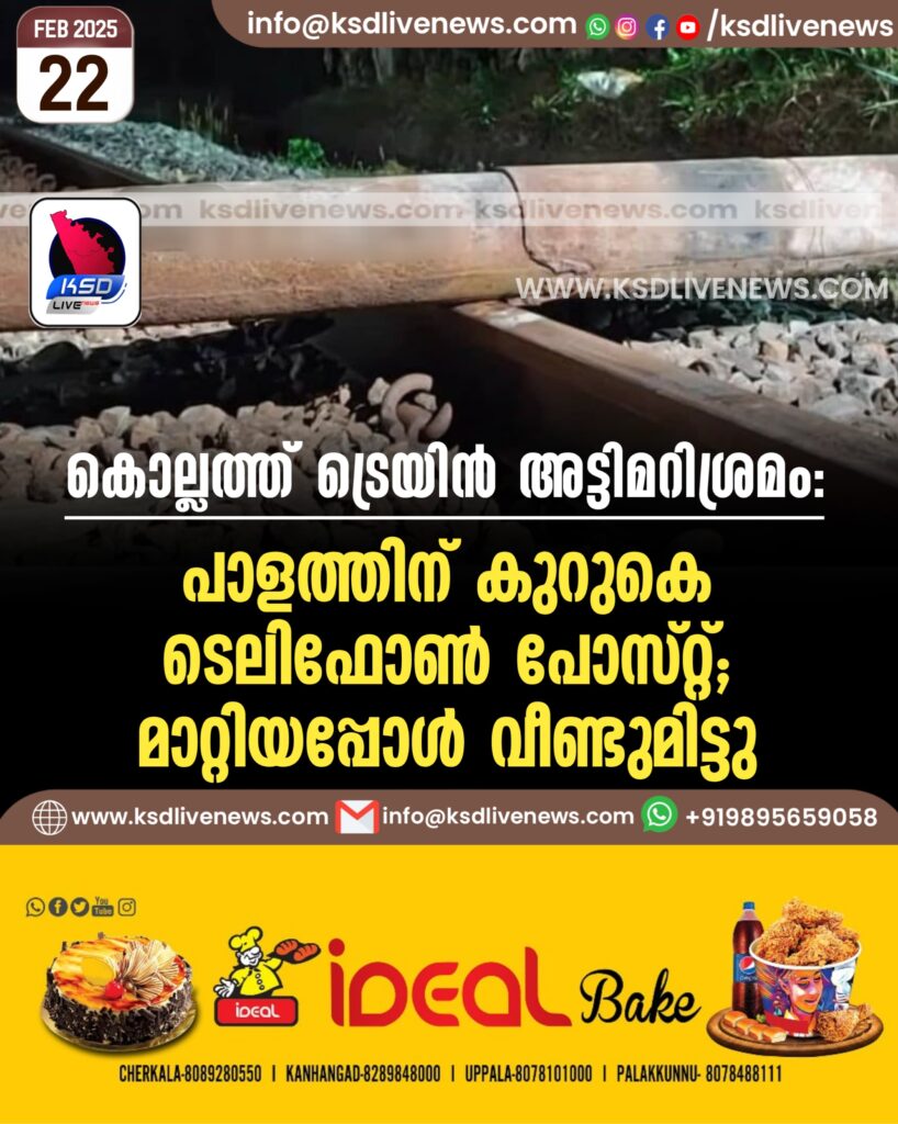 കൊല്ലത്ത് ട്രെയിൻ അട്ടിമറിശ്രമം: പാളത്തിന് കുറുകെ ടെലിഫോണ് പോസ്റ്റ്; മാറ്റിയപ്പോള് വീണ്ടുമിട്ടു