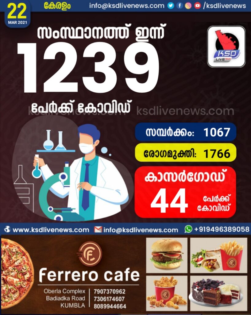 സംസ്ഥാനത്ത് ഇന്ന് 1239 പേർക്ക് കോവിഡ് സ്ഥിരീകരിച്ചു. സമ്പർക്കം വഴി 1067 പേർക്കും ; ആശ്വാസമായി 1766 പേർക്ക് രോഗ മുക്തിയും ; കാസർഗോഡ് ജില്ലയിൽ 44 പേർക്ക് പുതിയ കോവിഡ് കേസുകൾ ; മരണം 19
