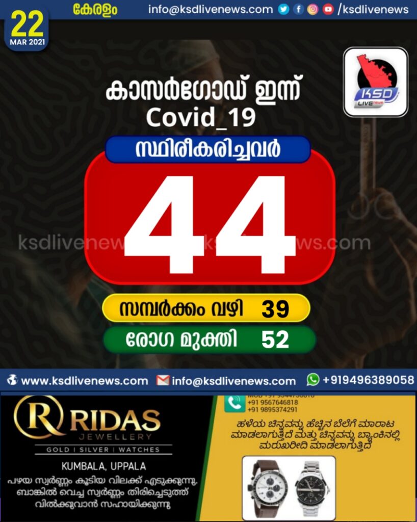 കാസര്കോട് ജില്ലയില് 44 പേര്ക്ക് കോവിഡ്, 52