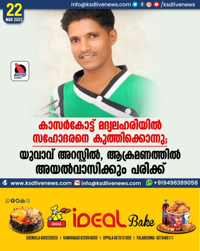 കാസര്‍കോട്ട് മദ്യലഹരിയില്‍ സഹോദരനെ കുത്തിക്കൊന്നു; യുവാവ് അറസ്റ്റില്‍, ആക്രമണത്തില്‍ അയല്‍വാസിക്കും പരിക്ക്
