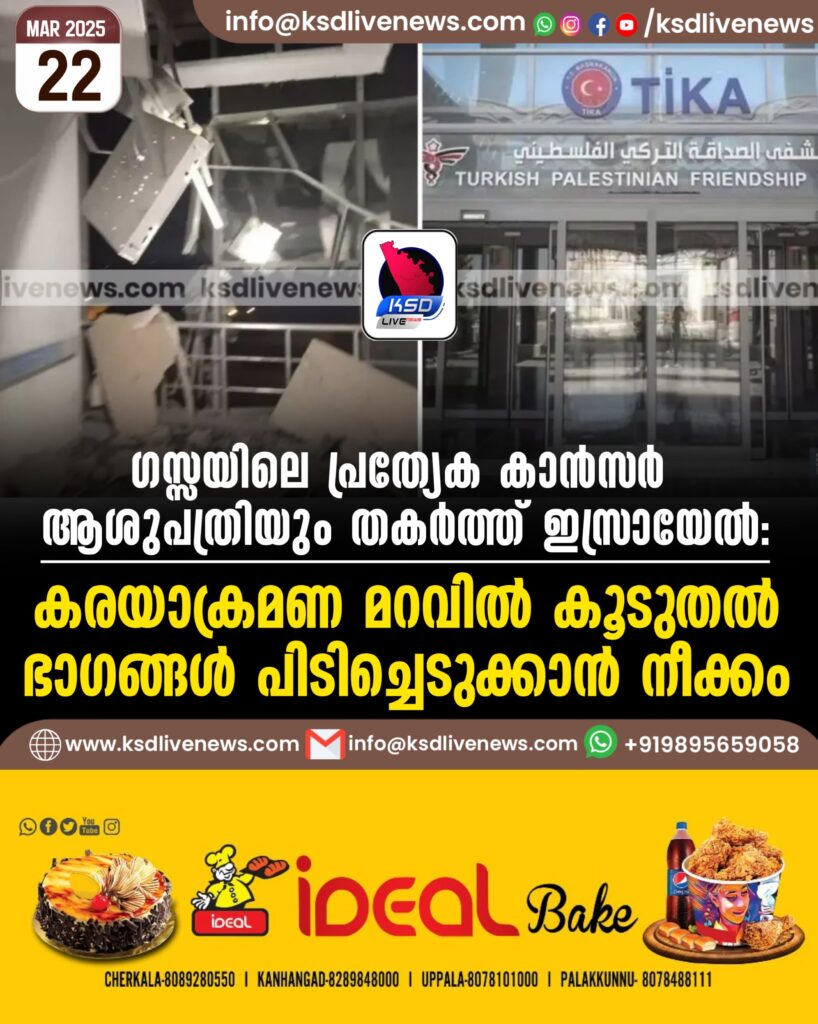 ഇസ്രായേല് നടപടി ഹീനമായ കുറ്റകൃത്യമാണെന്ന് ഗസ്സ ആരോഗ്യമന്ത്രാലയം പ്രതികരിച്ചു. നെറ്റ്സരിം ഇടനാഴിക്കു സമീപമാണ് കാൻസർ രോഗികള്ക്കുള്ള ഏക പ്രത്യേക ആശുപത്രിയായ തുർക്കിഷ്- ഫലസ്തീൻ ഫ്രണ്ട്ഷിപ്പ് ആശുപത്രി.