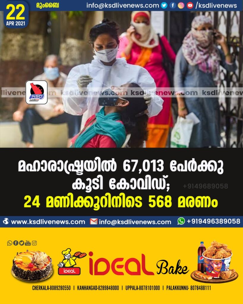 മഹാരാഷ്ട്രയില് 67,013 പേര്ക്കു കൂടി കോവിഡ്; 24 മണിക്കൂറിനിടെ 568 മരണം