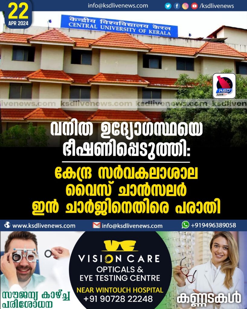 വനിത ഉദ്യോഗസ്ഥയെ ഭീഷണിപ്പെടുത്തി: കേന്ദ്ര സർവകലാശാല വൈസ് ചാൻസലർ ഇൻ ചാർജിനെതിരെ പരാതി