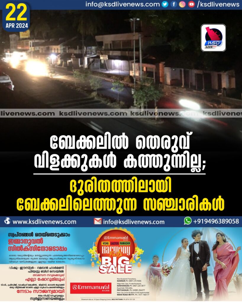 ബേക്കല്: കാസര്കോട് – കാഞ്ഞങ്ങാട് കെ.എസ്.ടി.പി സ്റ്റേറ്റ് ഹൈവേയിലെ ബേക്കല് ജംഗ്ഷന് മുതല് പെരിയ റോഡ് വരെ തെരുവ് വിളക്കുകള് ഇല്ലാത്തതിനാല് ദുരിതത്തിലായി ബേക്കലിലെത്തുന്ന സഞ്ചാരികള്. നിരവധി സഞ്ചാരികള് ദിനേന വന്ന് പോകുന്ന വിനോദ സഞ്ചാര കേന്ദ്രമായ ബേക്കല് ബീച്ച് പാര്ക്കിന്റെ സന്ദര്ശക സമയം 9 മണി വരെ ആക്കിയതോടെയാണ് രാത്രി ബസ്സ്റ്റോപ്പ് വരെ നടന്ന് പോകുന്ന സന്ദര്ശകര് ഇരുട്ടില് തപ്പി തടഞ്ഞ് പോവേണ്ട സ്ഥിതിയിലായത്. കുഗ്രാമങ്ങളില് പോലും തെരുവ് വിളക്കുകള് വെളിച്ചമേകുമ്പോള് പഞ്ചായത്തിന്റെ നിലാവ് തെരുവ് വിളക്ക് പദ്ധതി യാഥാര്ത്ഥ്യമാക്കുകയോ ബേക്കല് റിസോര്ട്ട്സ് ഡവലപ്മെന്റ് കോര്പറേഷനോ, ജില്ലാ ടൂറിസം കൗണ്സിലോ മുന് കൈ എടുത്ത് തെരുവ് വിളക്കുകള് സ്ഥാപിക്കണമെന്നാണ് നാട്ടുകാര് ആവശ്യപ്പെടുന്നത്.