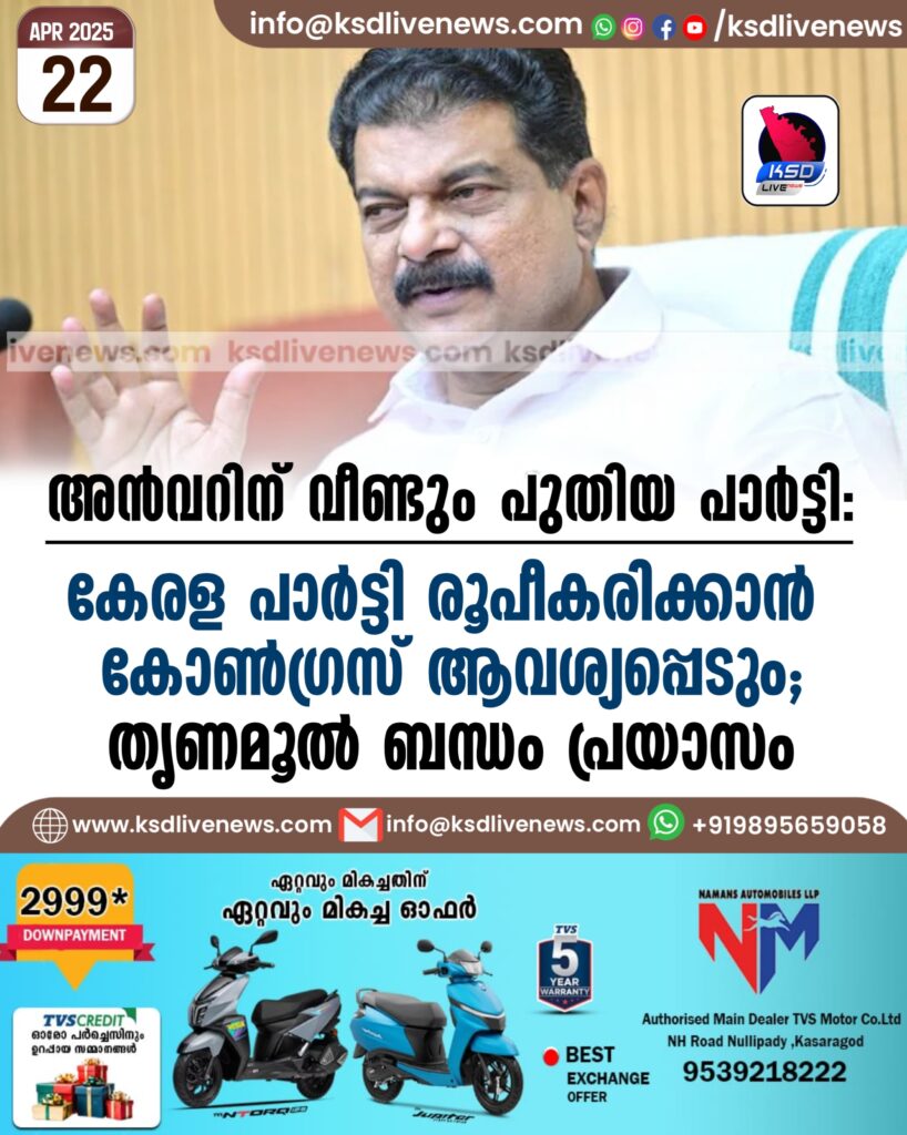 അൻവറിന് വീണ്ടും പുതിയ പാർട്ടി: കേരള പാർട്ടി രൂപീകരിക്കാൻ കോൺഗ്രസ് ആവശ്യപ്പെടും; തൃണമൂൽ ബന്ധം പ്രയാസം