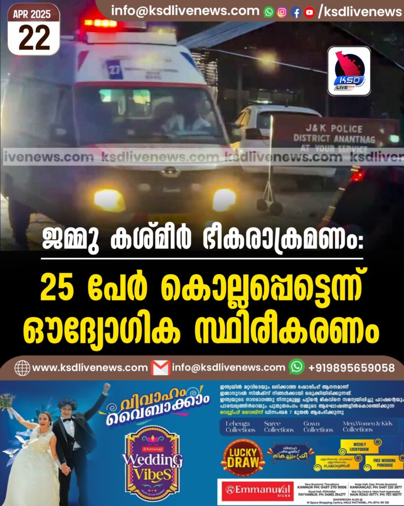 ജമ്മു കശ്മീര് ഭീകരാക്രമണം; 25 പേര് കൊല്ലപ്പെട്ടെന്ന് ഔദ്യോഗിക സ്ഥിരീകരണം