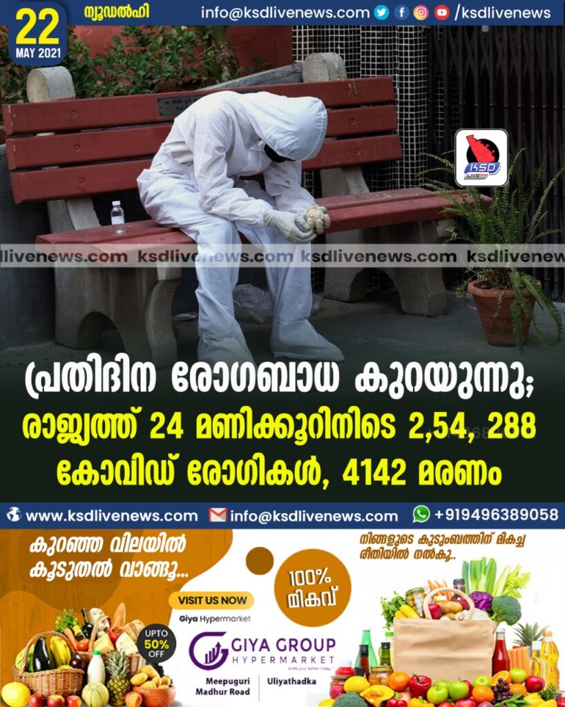 പ്രതിദിന രോഗബാധ കുറയുന്നു; രാജ്യത്ത് 24 മണിക്കൂറിനിടെ 2,54, 288 കോവിഡ് രോഗികള്, 4142 മരണം