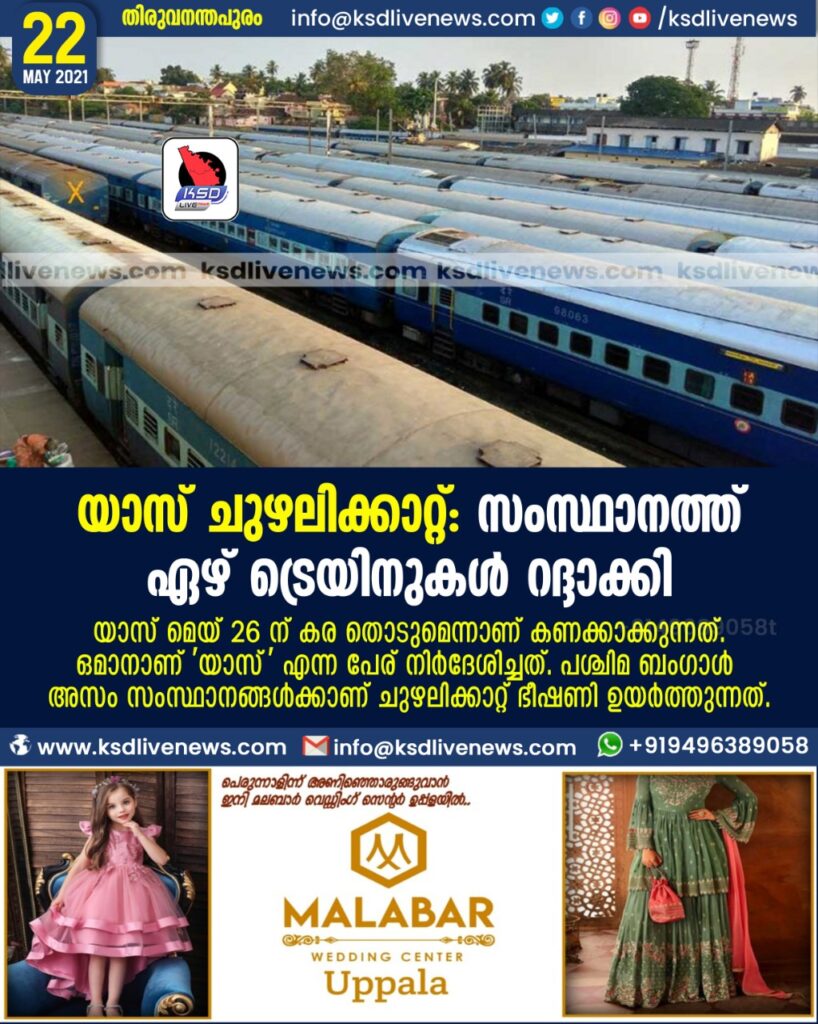 യാസ് ചുഴലിക്കാറ്റ്: സംസ്ഥാനത്ത് ഏഴ് ട്രെയിനുകള് റദ്ദാക്കി