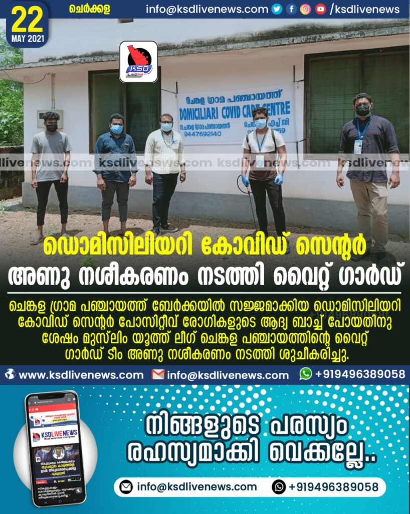 ചെങ്കള ഗ്രാമ പഞ്ചായത്ത്‌ ബേർക്കയിൽ സജ്ജമാക്കിയ ഡൊമിസിലിയറി കോവിഡ് സെന്റർ പോസിറ്റീവ് രോഗികളുടെ ആദ്യ ബാച്ച് പോയതിനു ശേഷം മുസ്‌ലിം യൂത്ത് ലീഗ് ചെങ്കള പഞ്ചായത്തിന്റെ വൈറ്റ് ഗാർഡ് ടീം അണു നശീകരണം നടത്തി ശുചീകരിച്ചു. അന്തു മേനംകോട്, ജാസിർ ചെങ്കള, മുത്തലിബ് ബേർക്ക, സിദ്ദിഖ് കുഞ്ഞിപള്ളി, സാദിക്ക് മൂല നേതൃത്വം നൽകി.