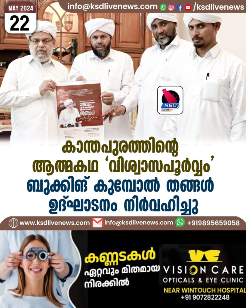 കാസറഗോഡ്: ഇന്ത്യൻ ഗ്രാൻഡ് മുഫ്തി കാന്തപുരം എ.പി. അബൂബക്കർ മുസ്ലിയാരുടെ ആത്മകഥയായ ‘വിശ്വാസപൂർവ്വം’ പുസ്തകത്തിന്റെ പ്രീ പബ്ലിക്കേഷൻ ബുക്കിംഗ് ജില്ലാ തല ഉദ്ഘാടനം സമസ്ത കേരള ജംഇയ്യത്തുൽ ഉലമ ഉപാധ്യക്ഷൻ സയ്യിദ് കെ എസ് ആറ്റക്കോയ തങ്ങൾ കുമ്പോൽ നിർവ്വഹിച്ചു.