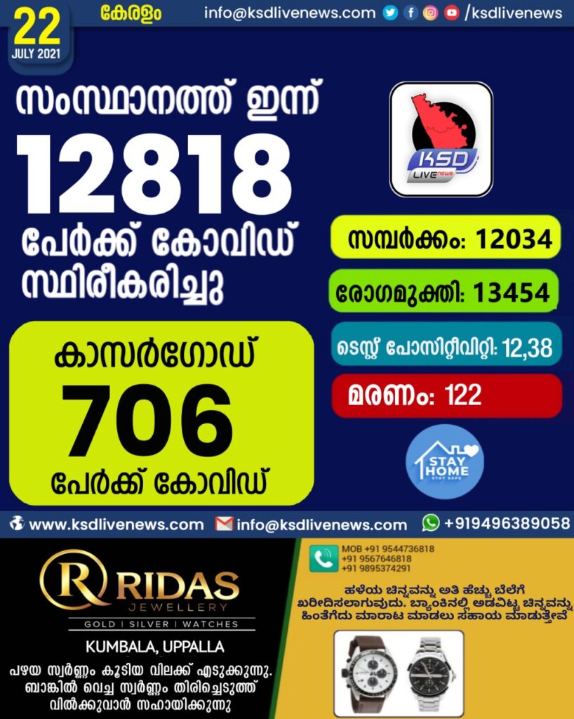സംസ്ഥാനത്ത് ഇന്ന് 12818 പേർക്ക് കോവിഡ് സ്ഥിരീകരിച്ചു. സമ്പർക്കം വഴി 12034 പേർക്കും ; ആശ്വാസമായി 13454 പേർക്ക് രോഗ മുക്തിയും ; കാസർഗോഡ് ജില്ലയിൽ 706 പേർക്ക് പുതിയ കോവിഡ് കേസുകൾ ; മരണം 122