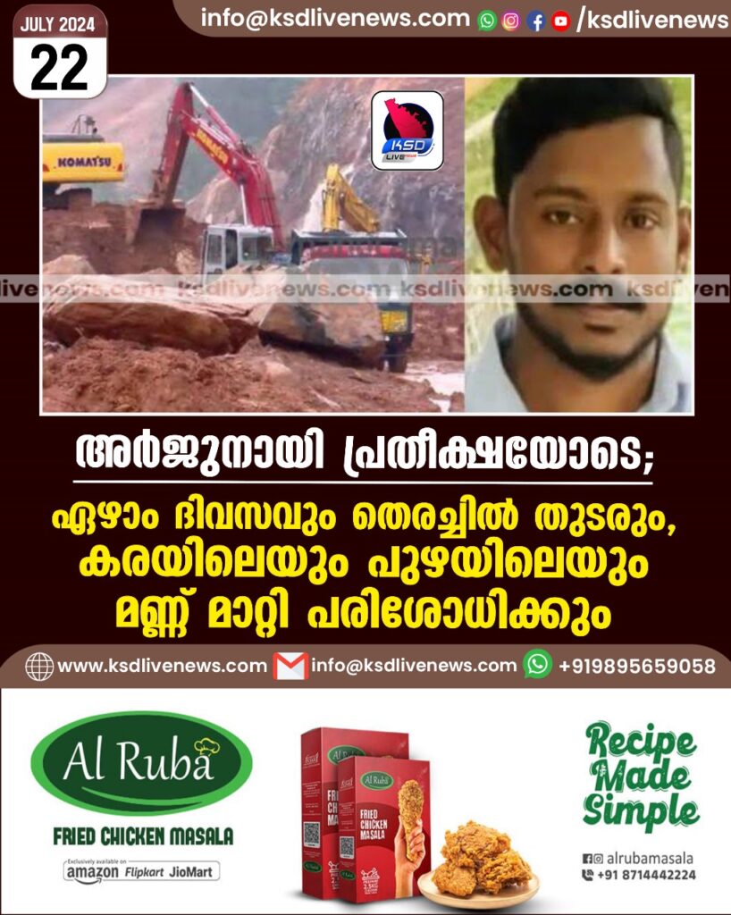 അർജുനായി പ്രതീക്ഷയോടെ; ഏഴാം ദിവസവും തെരച്ചിൽ തുടരും, കരയിലെയും പുഴയിലെയും മണ്ണ് മാറ്റി പരിശോധിക്കും
