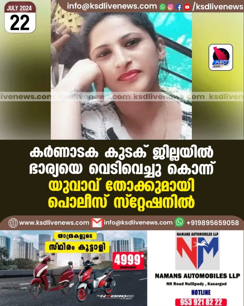 കർണാടക കുടക് ജില്ലയിൽ ഭാര്യയെ വെടിവെച്ചു കൊന്ന് യുവാവ് തോക്കുമായി പൊലീസ് സ്റ്റേഷനില്