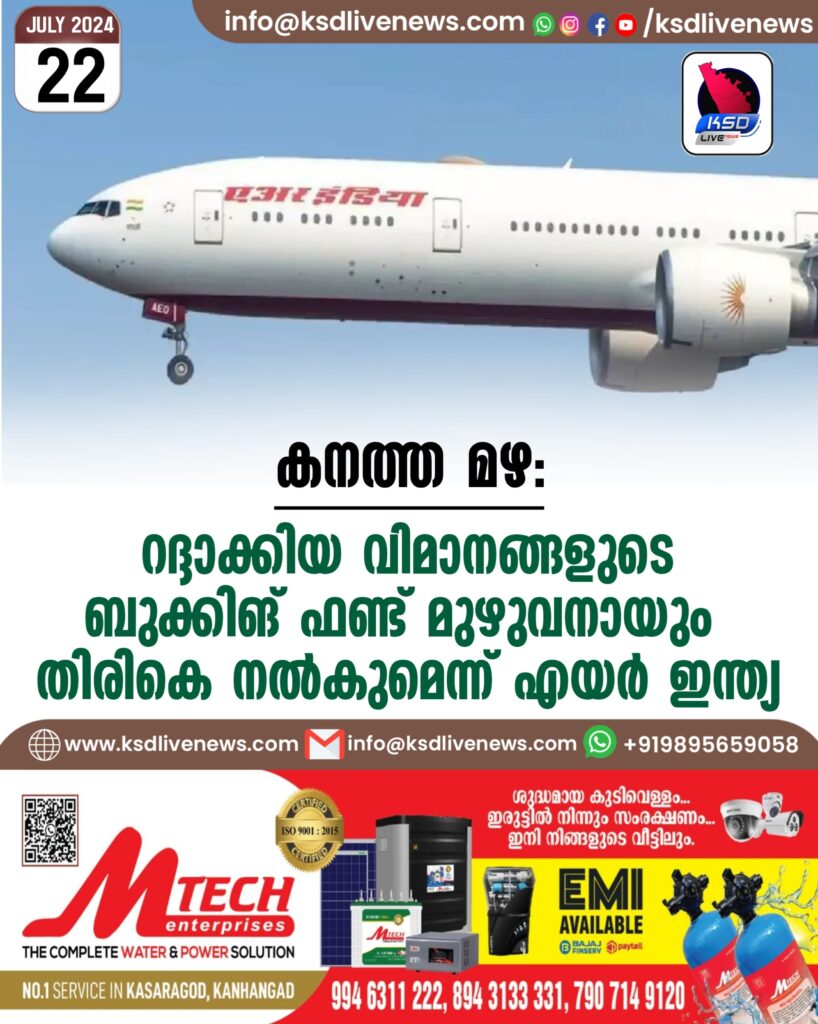 കനത്ത മഴ: റദ്ദാക്കിയ വിമാനങ്ങളുടെ ബുക്കിങ് ഫണ്ട് മുഴുവനായും തിരികെ നല്‍കുമെന്ന് എയര്‍ ഇന്ത്യ