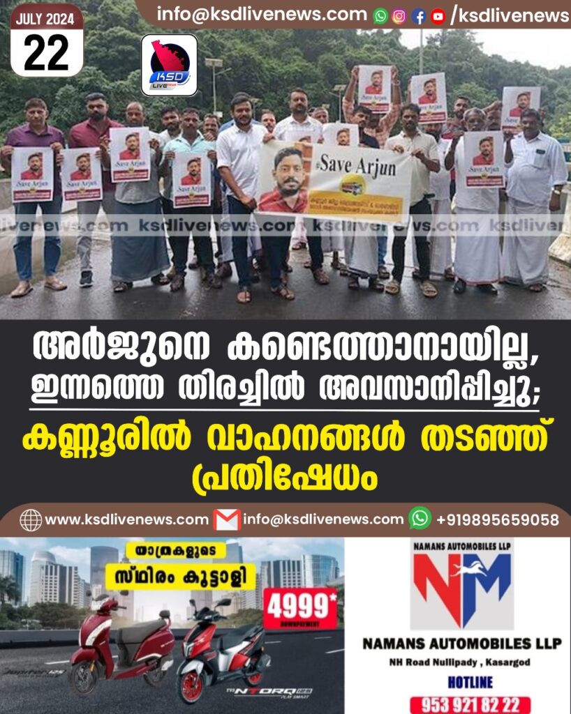 അർജുനെ കണ്ടെത്താനായില്ല, ഇന്നത്തെ തിരച്ചിൽ അവസാനിപ്പിച്ചു; കണ്ണൂരിൽ വാഹനങ്ങൾ തടഞ്ഞ് പ്രതിഷേധം