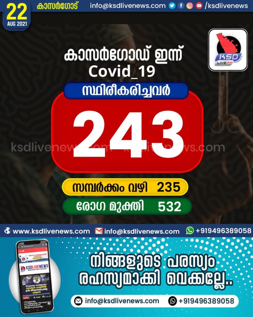 കാസർഗോഡ് ജില്ലയിൽ ഇന്ന് 243 പേർക്ക് കോവിഡ് സ്ഥിരീകരിച്ചു. സമ്പർക്കം വഴി 235 പേർക്കും. 532 പേർക്ക് രോഗമുക്തി