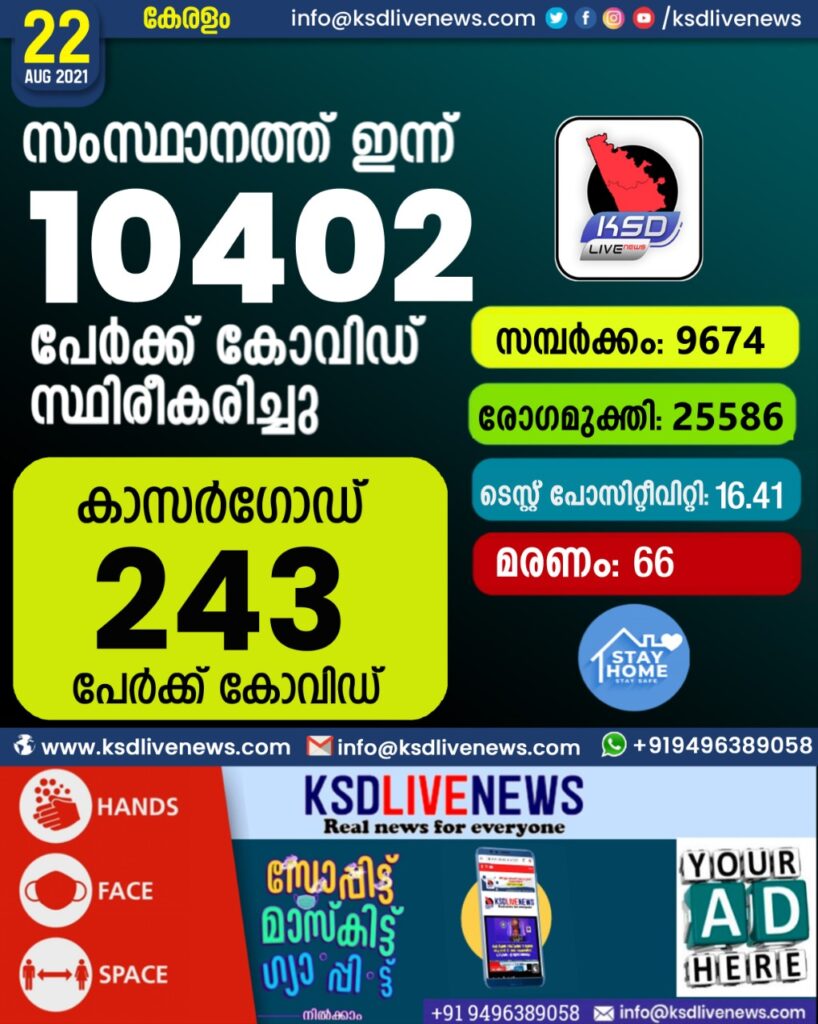 സംസ്ഥാനത്ത് ഇന്ന് 10402 പേർക്ക് കോവിഡ് സ്ഥിരീകരിച്ചു. സമ്പർക്കം വഴി 9674 പേർക്കും ; ആശ്വാസമായി 25586 പേർക്ക് രോഗ മുക്തിയും ; കാസർഗോഡ് ജില്ലയിൽ 243 പേർക്ക് പുതിയ കോവിഡ് കേസുകൾ ; മരണം 66