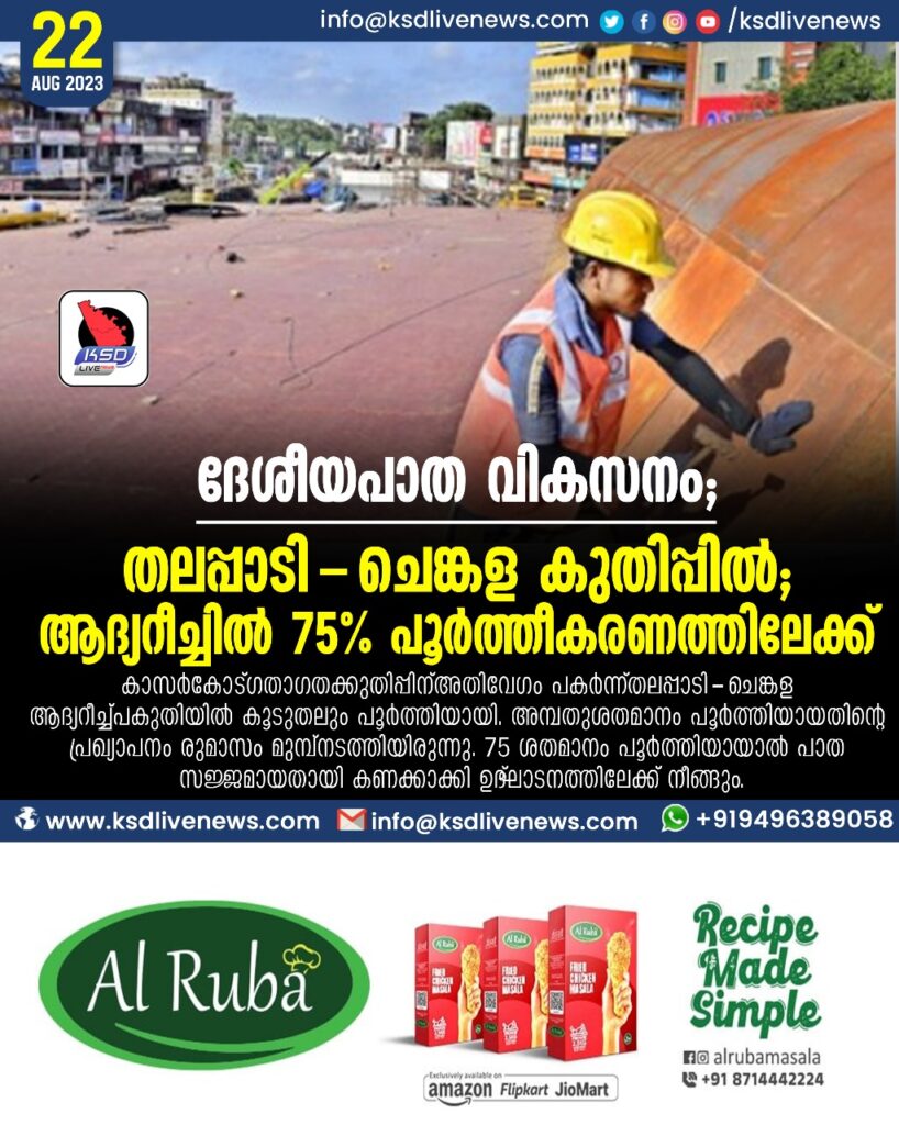 കാസർകോട്‌ > ഗതാഗതക്കുതിപ്പിന്‌ അതിവേഗം പകർന്ന്‌ തലപ്പാടി – ചെങ്കള ആദ്യറീച്ച്‌ പകുതിയിൽ കൂടുതലും പൂർത്തിയായി. അമ്പതുശതമാനം പൂർത്തിയായതിന്റെ പ്രഖ്യാപനം രണ്ടുമാസം മുമ്പ്‌ നടത്തിയിരുന്നു. 75 ശതമാനം പൂർത്തിയായാൽ പാത സജ്ജമായതായി കണക്കാക്കി ഉദ്‌ഘാടനത്തിലേക്ക്‌ നീങ്ങും.