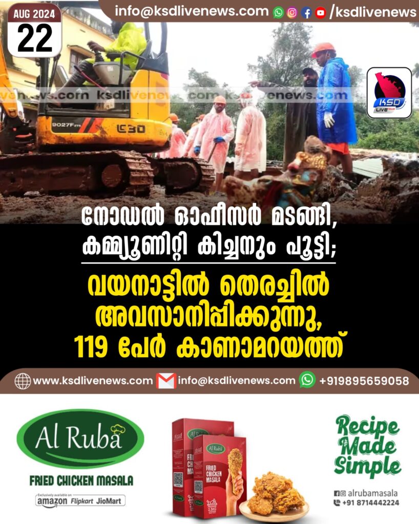 നോഡൽ ഓഫീസർ മടങ്ങി, കമ്മ്യൂണിറ്റി കിച്ചനും പൂട്ടി; വയനാട്ടിൽ തെരച്ചിൽ അവസാനിപ്പിക്കുന്നു, 119 പേർ കാണാമറയത്ത്