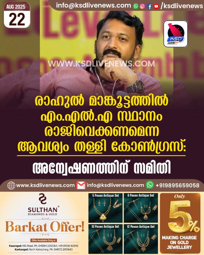 രാഹുല് മാങ്കൂട്ടത്തില് എംഎല്എ സ്ഥാനം രാജിവെക്കണമെന്ന ആവശ്യം തള്ളി കോണ്ഗ്രസ്; അന്വേഷണത്തിന് സമിതി