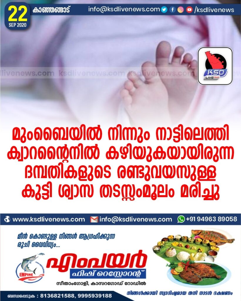 മുംബൈയിൽ നിന്നും നാട്ടിലെത്തി ക്വാറന്റൈനില് കഴിയുകയായിരുന്ന ദമ്പതികളുടെ രണ്ടുവയസുള്ള കുട്ടി ശ്വാസ തടസ്സംമൂലം മരിച്ചു