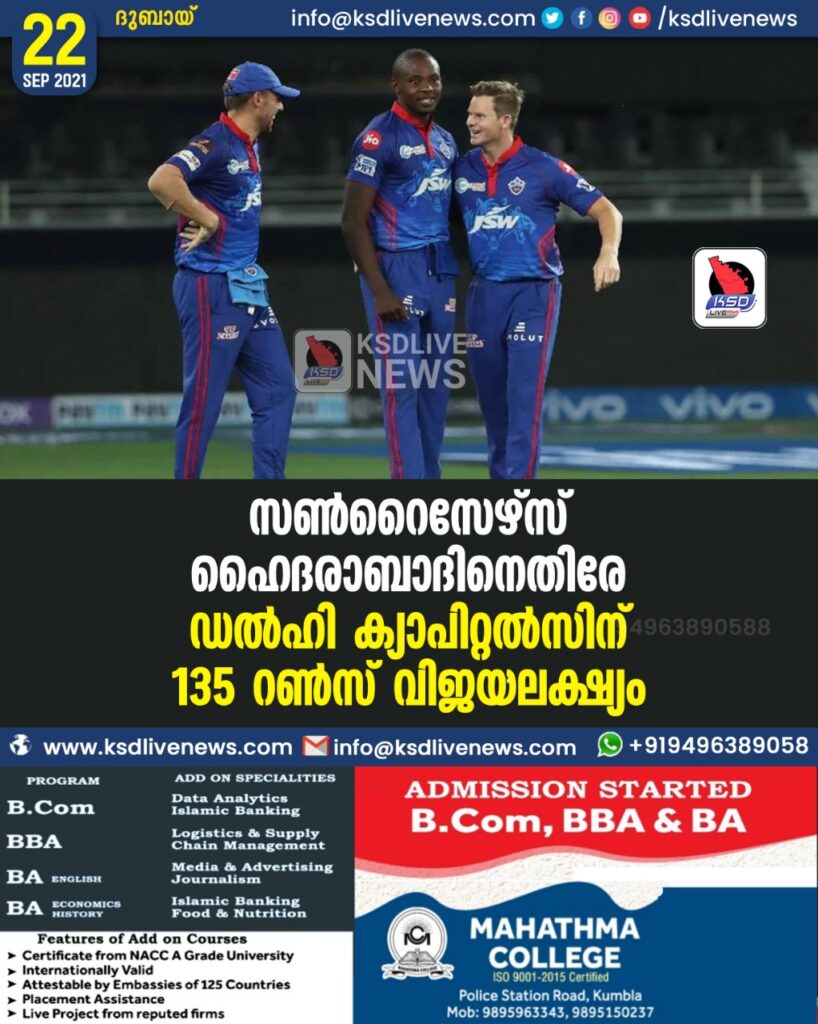 സണ്റൈസേഴ്സ് ഹൈദരാബാദിനെതിരേ ഡല്ഹി ക്യാപിറ്റല്സിന് 135 റണ്സ് വിജയലക്ഷ്യം