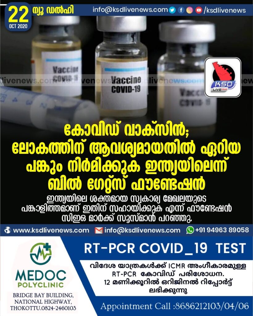 കോവിഡ് വാക്സിൻ ; ലോകത്തിന് ആവശ്യമായതിൽ ഏറിയ പങ്കും നിർമിക്കുക ഇന്ത്യയിലെന്ന് ബിൽ ഗേറ്റ്സ് ഫൗണ്ടേഷൻ