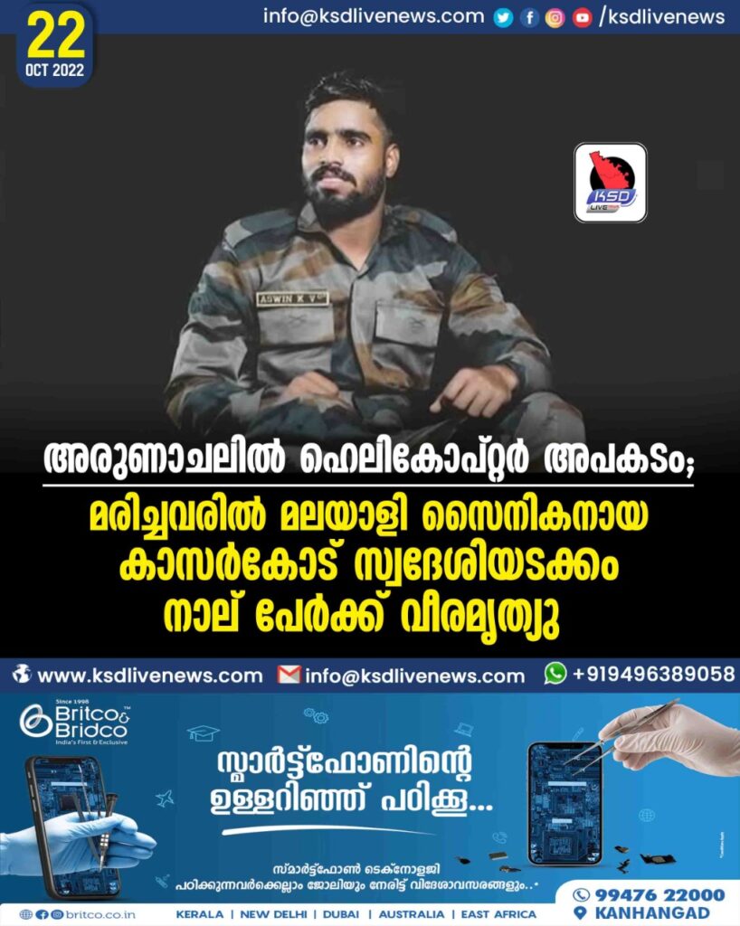 അരുണാചലില്‍ ഹെലികോപ്റ്റര്‍ അപകടം; മരിച്ചവരില്‍ മലയാളി സൈനികനായ കാസർകോട് സ്വദേശിയടക്കം നാല് പേർക്ക് വീരമൃത്യു
