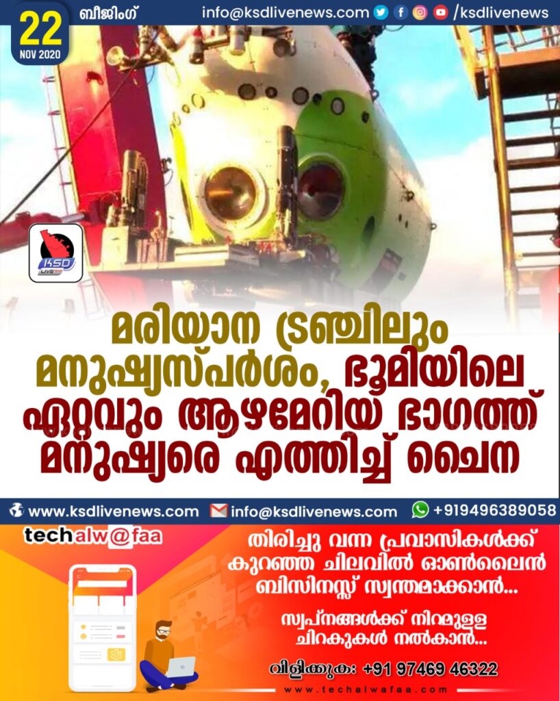 മരിയാന ട്രഞ്ചിലും മനുഷ്യസ്പർശം , ഭൂമിയിലെ ഏറ്റവും ആഴമേറിയ ഭാഗത്ത് മനുഷ്യരെ എത്തിച്ച് ചൈന