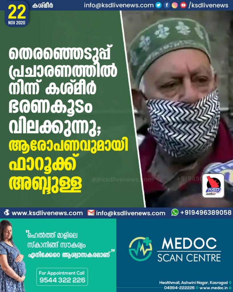 കശ്മീര്: ജമ്മു കശ്മീരിലെ ജില്ല വികസന സമിതികളിലേക്കുള്ള തെരഞ്ഞെടുപ്പുമായി ബന്ധപ്പെട്ട് ജനാധിപത്യ അവകാശങ്ങള് അട്ടിമറിക്കുന്നതായി മുന് മുഖ്യമന്ത്രി ഫറൂക്ക് അബ്ദുള്ള. ഗുപ്കര് സഖ്യത്തെ തെരഞ്ഞെടുപ്പ് പ്രചാരണത്തില് നിന്ന് കശ്മീര് ഭരണകൂടം വിലക്കുന്നുവെന്ന് ഫറൂക്ക് അബ്ദുള്ള ആരോപിച്ചു.