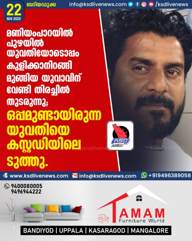 ബദിയഡുക്ക ; യുവതിക്കൊപ്പം കുളിച്ചു കൊണ്ടിരിക്കുകയായിരുന്ന യുവാവിനെ പുഴയില് കാണാതായതായി പരാതി. സംഭവത്തില് പോലീസ് അന്വേഷണം തുടങ്ങി.