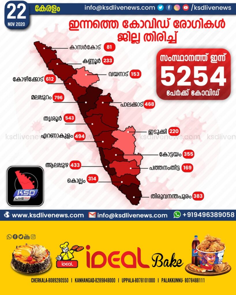 സംസ്ഥാനത്ത് ഇന്ന് 5254 പേര്ക്ക് കോവിഡ്-19 സ്ഥിരീകരിച്ചു. മലപ്പുറം 796, കോഴിക്കോട് 612, തൃശൂര് 543, എറണാകുളം 494, പാലക്കാട് 468, ആലപ്പുഴ 433, തിരുവനന്തപുരം 383, കോട്ടയം 355, കൊല്ലം 314, കണ്ണൂര് 233, ഇടുക്കി 220, പത്തനംതിട്ട 169, വയനാട് 153, കാസര്ഗോഡ് 81 എന്നിങ്ങനേയാണ് ജില്ലകളില് ഇന്ന് രോഗ ബാധ സ്ഥിരീകരിച്ചത്.