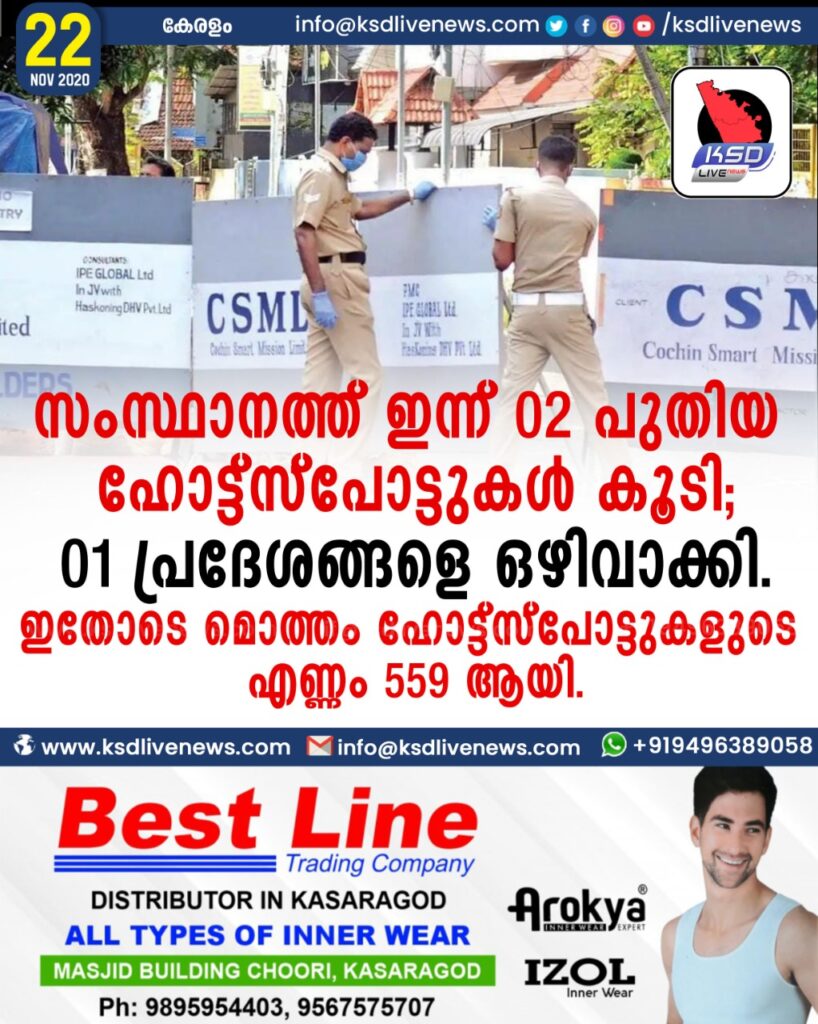 ഒരു പ്രദേശത്തെ ഹോട്ട് സ്പോട്ടില് നിന്നും ഒഴിവാക്കിയിട്ടുണ്ട്. ഇതോടെ ആകെ 559 ഹോട്ട് സ്പോട്ടുകളാണുള്ളത്