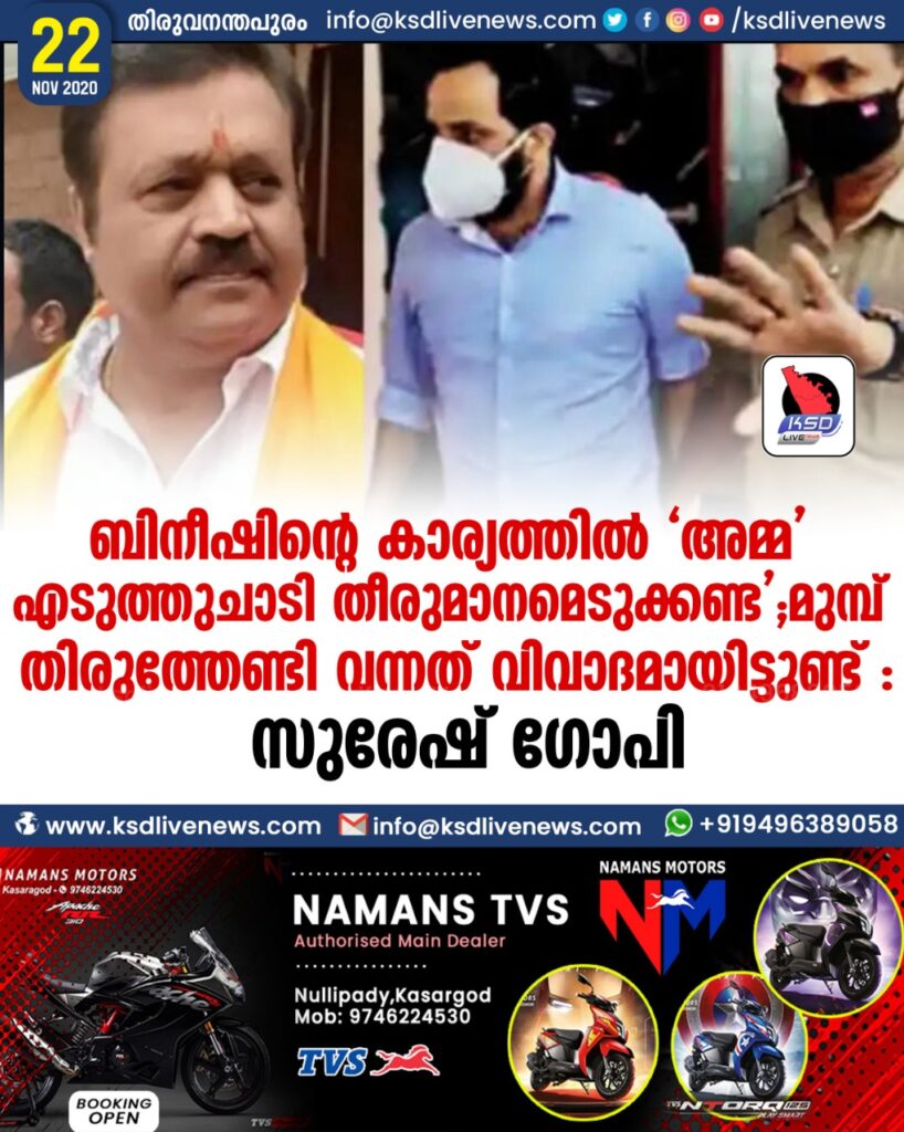 ബിനീഷിന്റെ കാര്യത്തിൽ ‘ അമ്മ ‘ എടുത്തുചാടി തീരുമാനമെടുക്കണ്ട ‘ ; മുമ്പ് തിരുത്തേണ്ടി വന്നത് വിവാദമായിട്ടുണ്ട് : സുരേഷ് ഗോപി