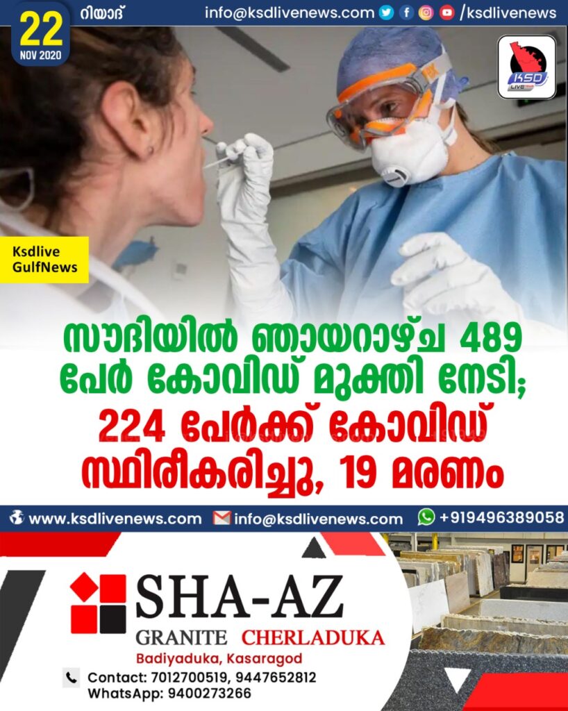 സൗദിയില് ഞായറാഴ്ച 489 പേര് കോവിഡ് മുക്തി നേടി ; 224 പേര്ക്ക് കോവിഡ് സ്ഥിരീകരിച്ചു . 19 മരണം