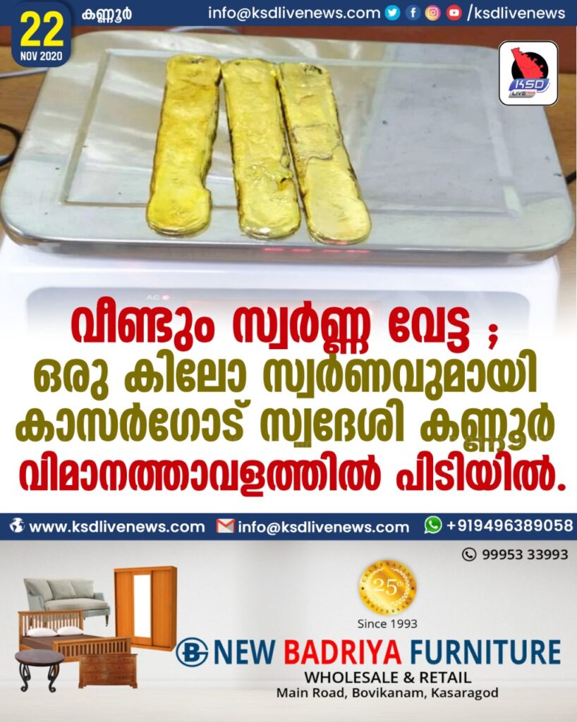 വീണ്ടും സ്വർണ്ണ വേട്ട ; ഒരു കിലോ സ്വര്‍ണവുമായി കാസർഗോഡ് സ്വദേശി കണ്ണൂര്‍ വിമാനത്താവളത്തില്‍ പിടിയില്‍.