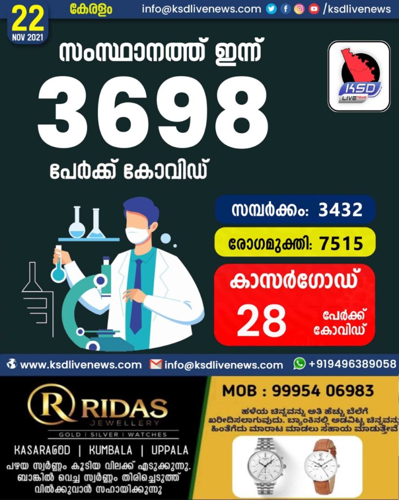 ആശ്വസം; സംസ്ഥാനത്ത് ഇന്ന് 3698 പേർക്ക് കോവിഡ് സ്ഥിരീകരിച്ചു. സമ്പർക്കം വഴി 3432 പേർക്കും ; ആശ്വാസമായി 7515 പേർക്ക് രോഗ മുക്തിയും ; കാസർഗോഡ് ജില്ലയിൽ 28 പേർക്ക് പുതിയ കോവിഡ് കേസുകൾ ; മരണം 75