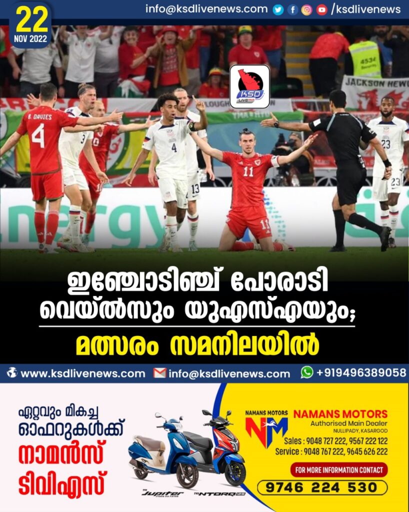 ഇഞ്ചോടിഞ്ച് പോരാടി വെയ്ല്സും യുഎസ്എയും; മത്സരം സമനിലയില്