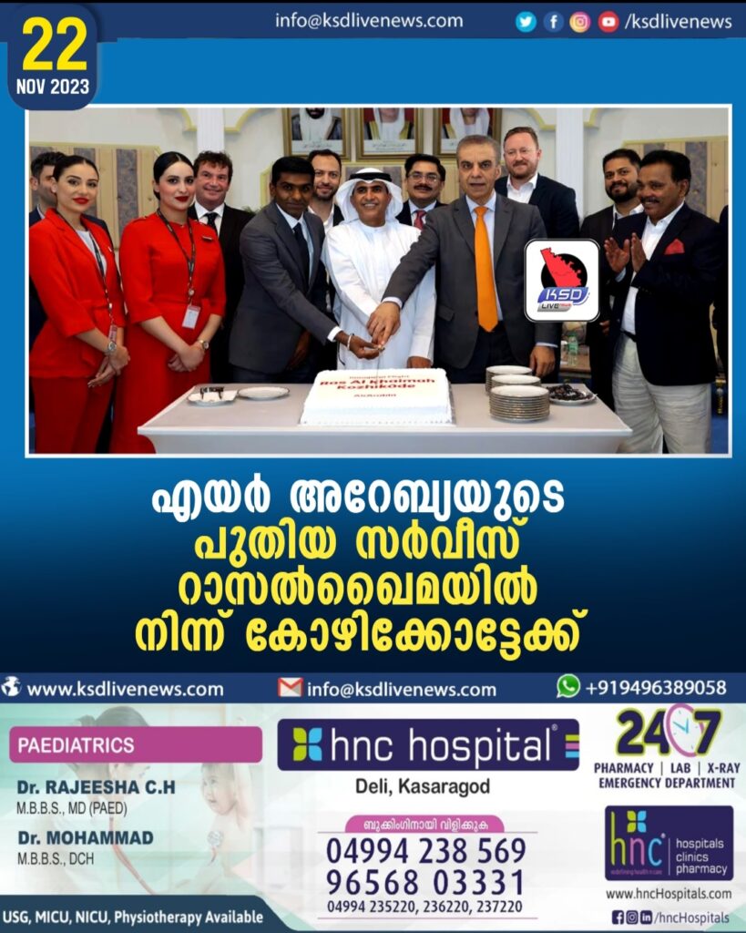 റാസൽഖൈമ∙ വടക്കൻ എമിറേറ്റുകളിലെ മലയാളികൾക്ക് ആഹ്ളാദം പകർന്ന് ഷാർജയുടെ ബജറ്റ് എയർലൈൻസായ എയർ അറേബ്യ റാസൽഖൈമയിൽ നിന്ന് കോഴിക്കോട്ടേക്ക് നേരിട്ട് പറന്നുതുടങ്ങി.  ഇന്ന് റാക് രാജ്യാന്തര വിമാനത്താവളത്തിൽ നടന്ന ഉദ്ഘാടന ചടങ്ങിൽ റാക് സിവിൽ വ്യോമയാന വിഭാഗം ചെയർമാൻ ഷെയ്ഖ് സാലിം ബിൻ സുൽത്താൻ അൽ ഖാസിമി, ദുബായിലെ ഇന്ത്യൻ കോൺസൽ ജനറൽ സതീഷ് കുമാർ ശിവൻ, എയർ അറേബ്യ ഗ്രൂപ്പ് ഓഫ് ചീഫ് എക്സിക്യുട്ടീവ് ആദില്‍ അലി, മറ്റു പ്രമുഖ വ്യക്തികൾ എന്നിവർ സംബന്ധിച്ചു.