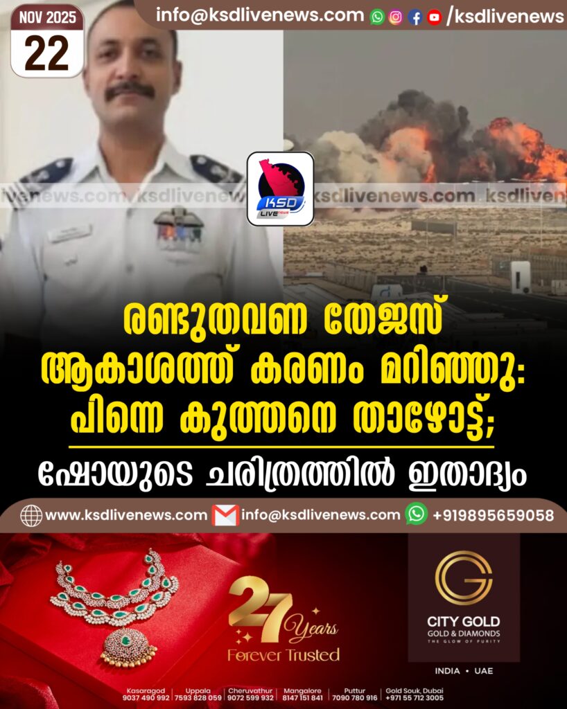 ദുബായ്: ദുബായ് എയർഷോയിലെ അഭ്യാസപ്രകടനത്തിനിടെ വ്യോമസേനയുടെ തേജസ് യുദ്ധവിമാനം തകർന്ന് പൈലറ്റ് മരിച്ചു. പ്രാദേശികസമയം വെള്ളിയാഴ്ച ഉച്ചതിരിഞ്ഞ് 2.15-ന് അൽ മഖ്തൂം വിമാനത്താവളത്തിനുസമീപമാണ് അപകടം. പൈലറ്റിന് പുറത്തേക്കു ചാടാൻ കഴിഞ്ഞില്ല. ഹിമാചൽ പ്രദേശിൽനിന്നുള്ള വിങ് കമാൻഡർ നമംശ് സ്യാൽ (37) ആണ് വിമാനം പറത്തിയിരുന്നത്.