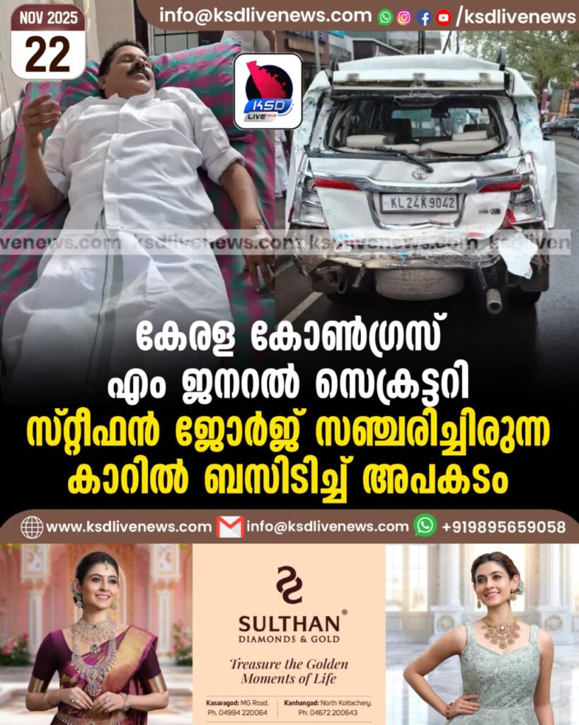 കേരള കോണ്‍ഗ്രസ് എം ജനറല്‍ സെക്രട്ടറി സ്റ്റീഫന്‍ ജോര്‍ജ് സഞ്ചരിച്ചിരുന്ന കാറില്‍ ബസിടിച്ച് അപകടം