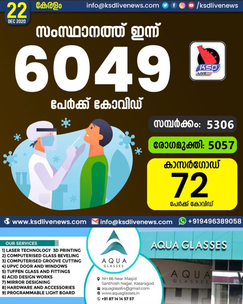 സംസ്ഥാനത്ത് ഇന്ന് 6049 പേർക്ക് കോവിഡ് സ്ഥിരീകരിച്ചു. സമ്പർക്കം വഴി 5306 പേർക്കും ; ആശ്വാസമായി 5057 പേർക്ക് രോഗ മുക്തിയും ; കാസർഗോഡ് ജില്ലയിൽ 72 പേർക്ക് പുതിയ കോവിഡ് കേസുകൾ ; മരണം 27